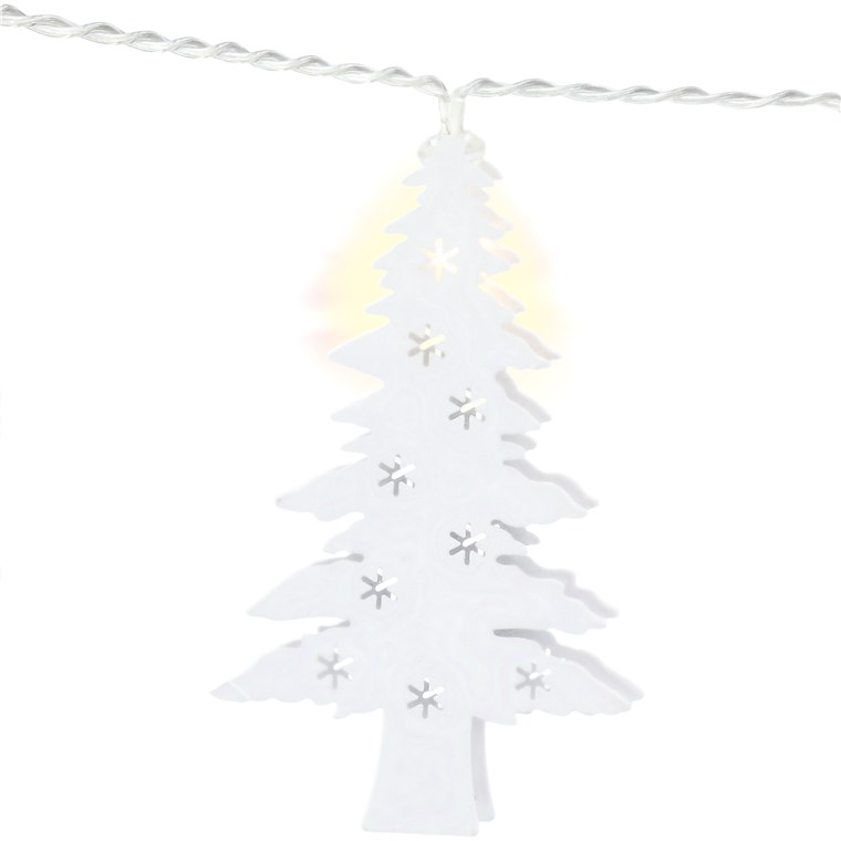 - Jedes Lämpchen ist mit einem Anhänger aus Metall in Form eines weißen Mini-Tannenbaums verziert.