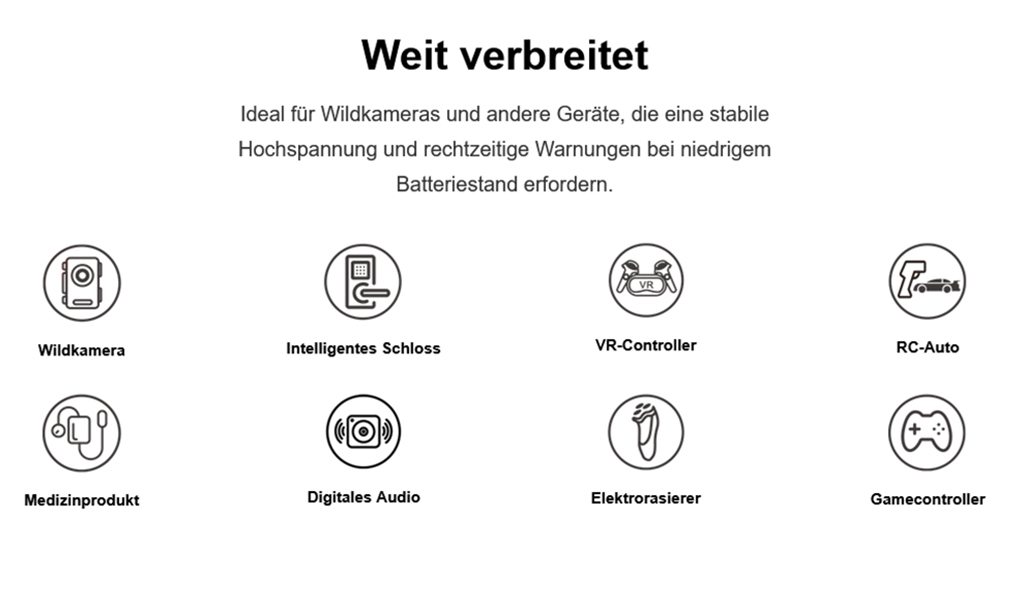 - Stabile 1,5 V Ausgangsspannung – ideal für Wildkameras, Taschenlampen und Fotozubehör