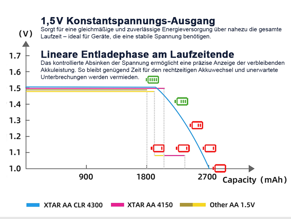 Neben der konstanten Ausgangsspannung von 1,5 V bietet der XTAR CLR 4300 mWh Akku eine integrierte Unterspannungsabschaltung – ein entscheidender Vorteil gegenüber herkömmlichen NiMH- oder NiCd-Akkus.