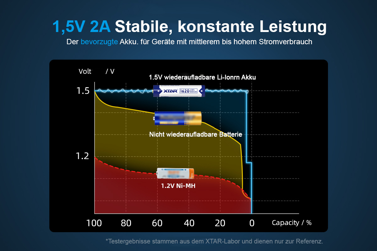 Große Vorteile bietet der Akku durch die Unterspannungsabschaltung. Die meisten Anwendungen besitzen keine eigene Unterspannungsabschaltung, schädigen jedoch den elektronisch geregelten 1,5V Li-Ionen Akku nicht, wie das der Fall bei Ni-MH / Ni-CD Akkus ist. 1000 Ladezyklen sind somit mit dem 1,5V Lithium-Ionen-Akku unter realen Bedingungen